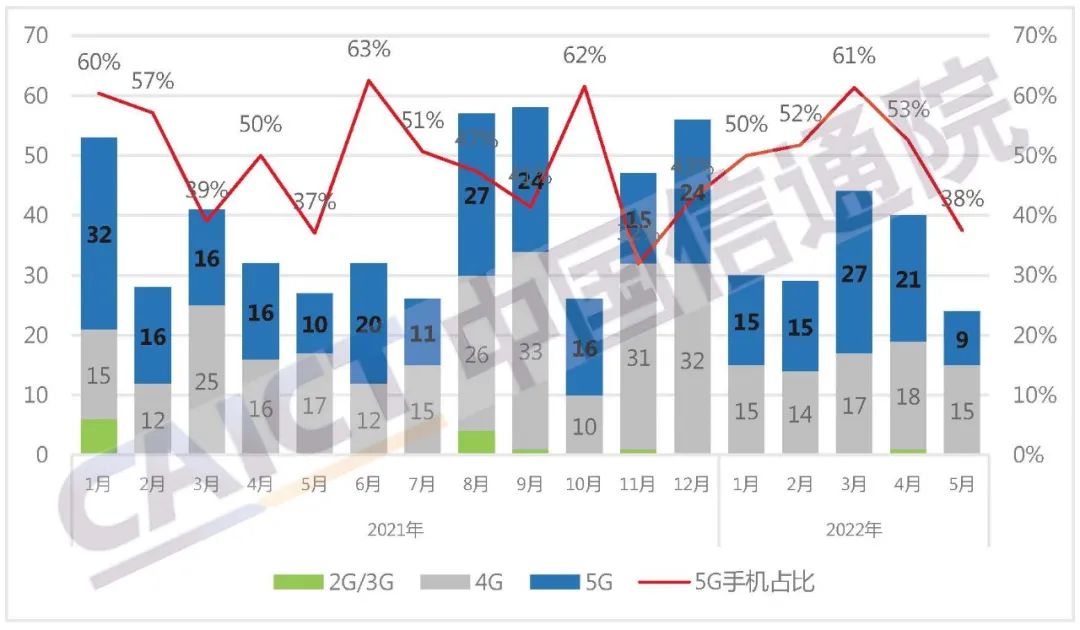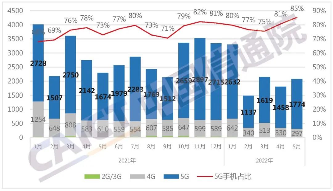 2022年5月,国内商场手机出货量2080.5万部,同比下降9.4%,其间,5G手机1773.9万部,同比增加6.0%,占同期手机出货量的85.3%。