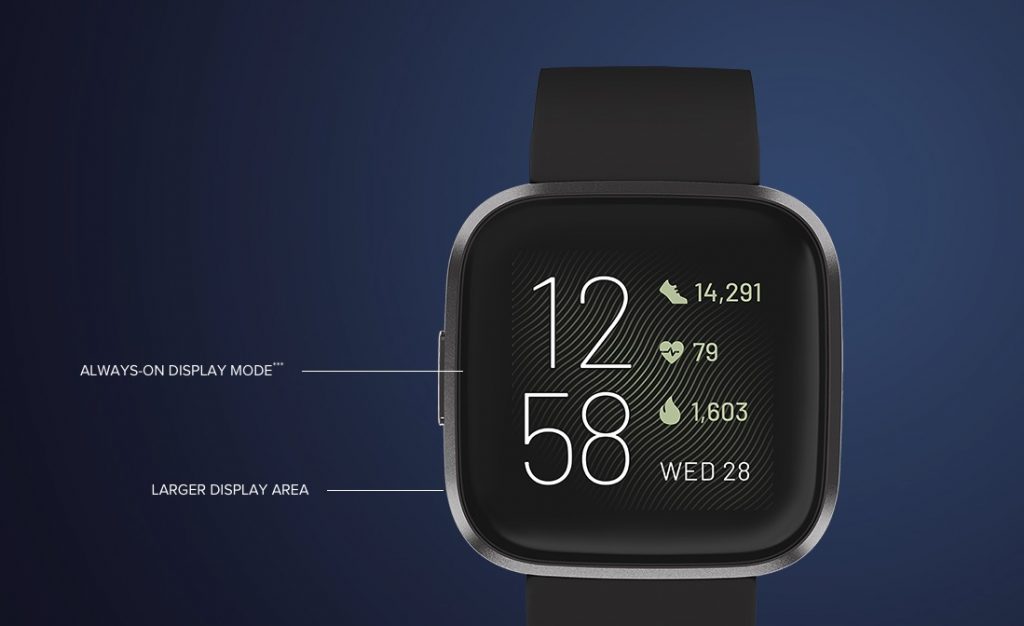 除了屏幕尺度变大以外,Versa 2 的边框也变窄了一些,屏幕下方的 logo 也被撤掉。Versa 2 在按键上也进行了一些精简,去掉上一代右侧的两颗按键,只保存左边的一颗。