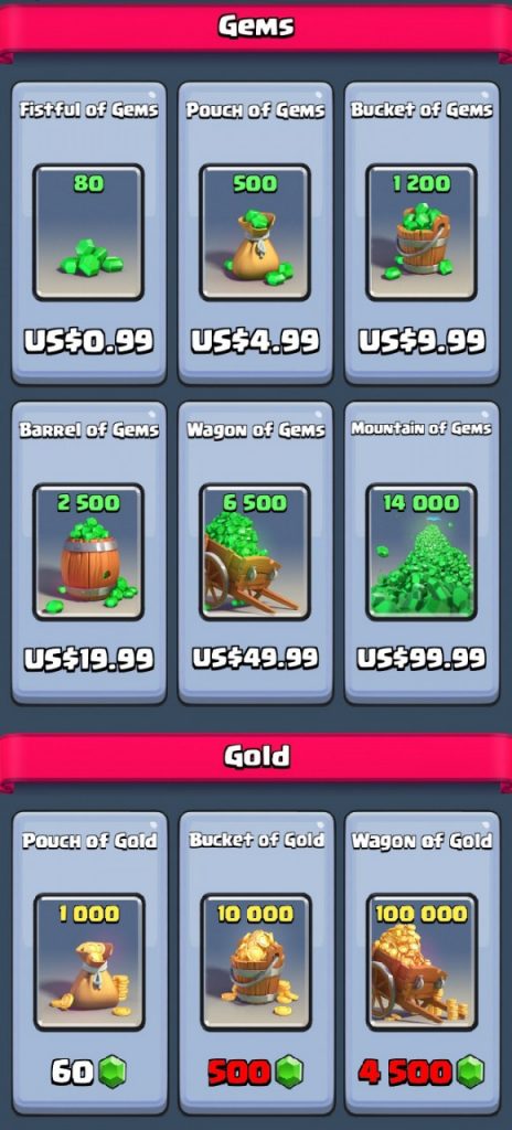 经典战略游戏 部落抵触:皇室战役Clash Royale 就采用了以上办法推销自己的游戏钱银。从图片可见,游戏充值页面上不止并排摆放了数量纷歧的宝石单品,并排出价钱以作比较,还运用了形象化的图像和称号(一撮 Fistful、一袋Pouch、一桶Bucket、一大座Moutain),着重单品数量差异。这让用户更能感觉购买许多宝石比较值得,然后舍得投入一笔较大金额。