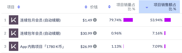 依据消费数据洞悉渠道量数 AI ( Measurable AI https://www.measurable.ai/zh-cn )的数据,Keep 的内购单品中,包月会员销量最好,占销量79.74%,奉献53.94%销售额,远远抢先其他单品,很有或许是「价格锚定」战略的作用。