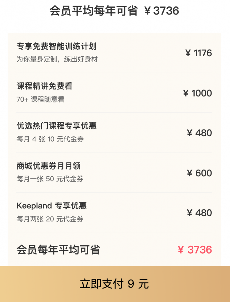 国内也有不少运用程式采纳这个战略,傍边包含最近很火的健身App Keep。Keep 的做法乃至比 部落抵触:皇室战役 还要直接。在会员订阅页面上,清楚列出了会员享有优惠的本来价格,并以此与订阅费用比照,成功营建出「成为会员便能替用户省下一大笔钱」的概念。这些小廉价成功招引不少用户付费订阅。