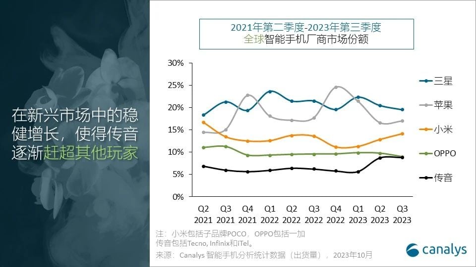 Canalys的高档分析师Sanyam Chaurasia表明,“跟着节日旺季接近,新式商场对新品的需求不断增加,推进着品牌和途径的开展。小米和传音坚持上一季度的微弱体现,使其成为前五名中仅有完成增加的厂商。小米在2023年上半年成功使库存回归正常水位,并在新式商场活跃发布了具有性价比的红米数字系列入门机型,使其在三季度重拾增加动能。与此同时,传音在其非洲中心商场的出货有所抬升,并协助其达成了惊人的40%同比增加。虽然这些商场存在钱银动摇和进口约束,但新的晋级需求依然存在,顾客也逐步习惯了高通胀环境。在中东商场,传音经过强壮的本地团队在一些贱价商场捉住了增加的低端需求。而在拉美商场,活跃的途径建造以及新品发布也协助传音在当地进一步扩张。”