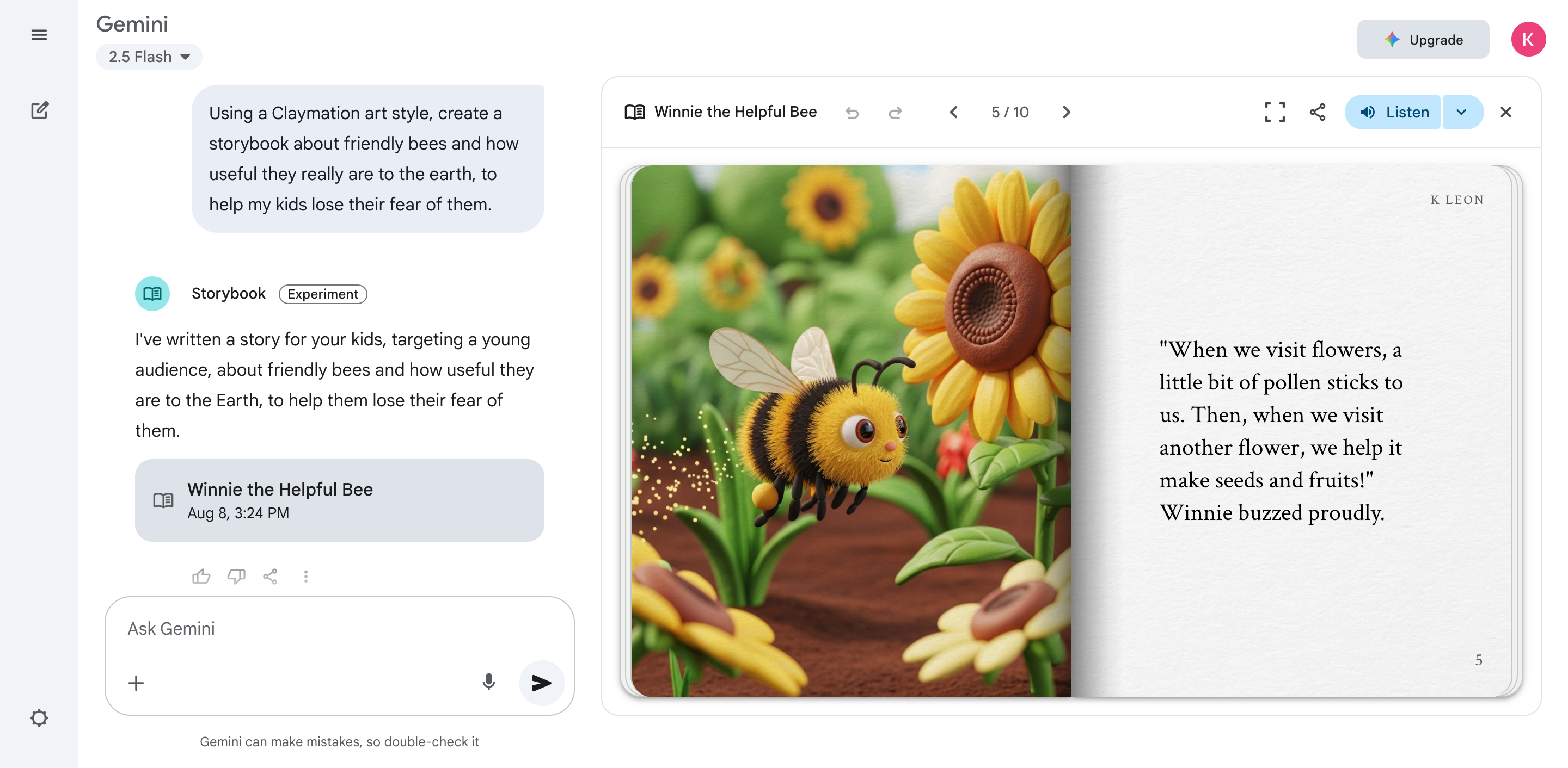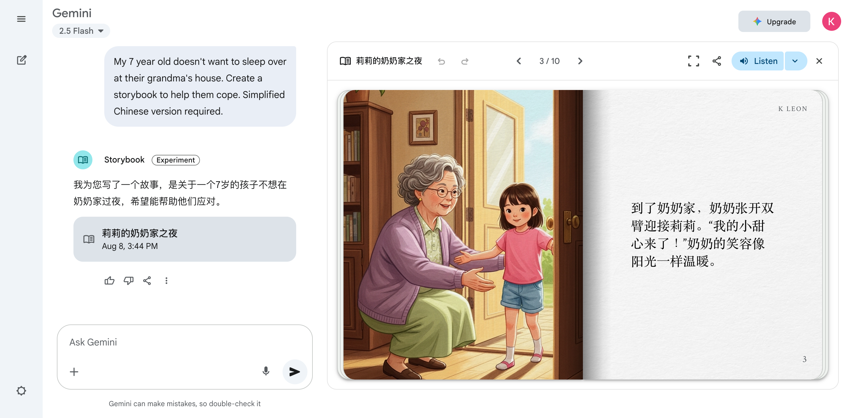 一项名为“Storybook”的新功用,让家长只需几句话,就能为孩子生成一本带插画和朗诵的10页故事书。无论是在临睡前,仍是在出行途中,家长都能够快速为孩子预备一本绝无仅有的读物。运用方法很简单:输入一个故事的主意,例如“讲一个关于蜜蜂维护地球的故事”,Gemini就会生成完好的情节,并匹配一系列插画。你还能够指定插画的风格,从黏土动画、像素风、漫画,到可供上色的涂色书,挑选超越十种。